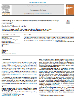 In August 2023, Qi Zhenyan, a student in our institute published a paper titled “Familiarity Bias and Economic Decisions: Evidence from a Survey Experiment” as the second author in the high-quality English journal Economics Letters (SSCI Q 3, ABS 3-star, with the supervisor as the first author).