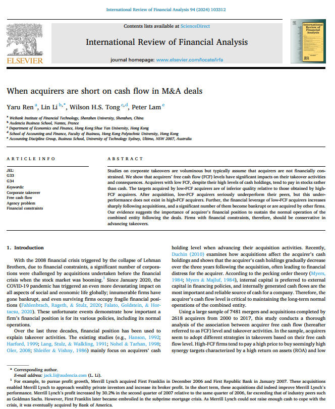 The study shows that acquirer’s free cash flow (FCF) levels have significant impacts on their takeover activities and consequences. Acquirers with low FCF, despite their high levels of cash holdings, tend to pay in stocks rather than cash. The targets acquired by low-FCF acquirers are of inferior quality relative to those obtained by high-FCF acquirers. After acquisition, low-FCF acquirers seriously underperform their peers, but this under-performance does not exist in high-FCF acquirers. Further, the financial leverage of low-FCF acquires increases sharply following acquisitions, and a significant number of them become bankrupt or are acquired by other firms. The study suggests the importance of acquirer’s financial position to sustain the normal operation of the combined entity following the deals. Firms with financial constraints, therefore, should be conservative in advancing takeovers.