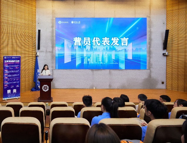 2023湾区(深圳)数字金融夏令营优秀营员代表常嘉欣(2022届管理科学与工程学术研究生)在开营仪式上分享了她的参营经历和收获。她以自己的亲身经历,鼓励新营员们珍惜这次难得的学习机会,积极参与各项活动,努力提升自己的专业能力和综合素质。本届夏令营营员代表曾泓源同学也表达了对夏令营生活的期待与憧憬,并表示将全力以赴,以饱满的热情和坚定的信念,投入到夏令营的学习和实践中去。