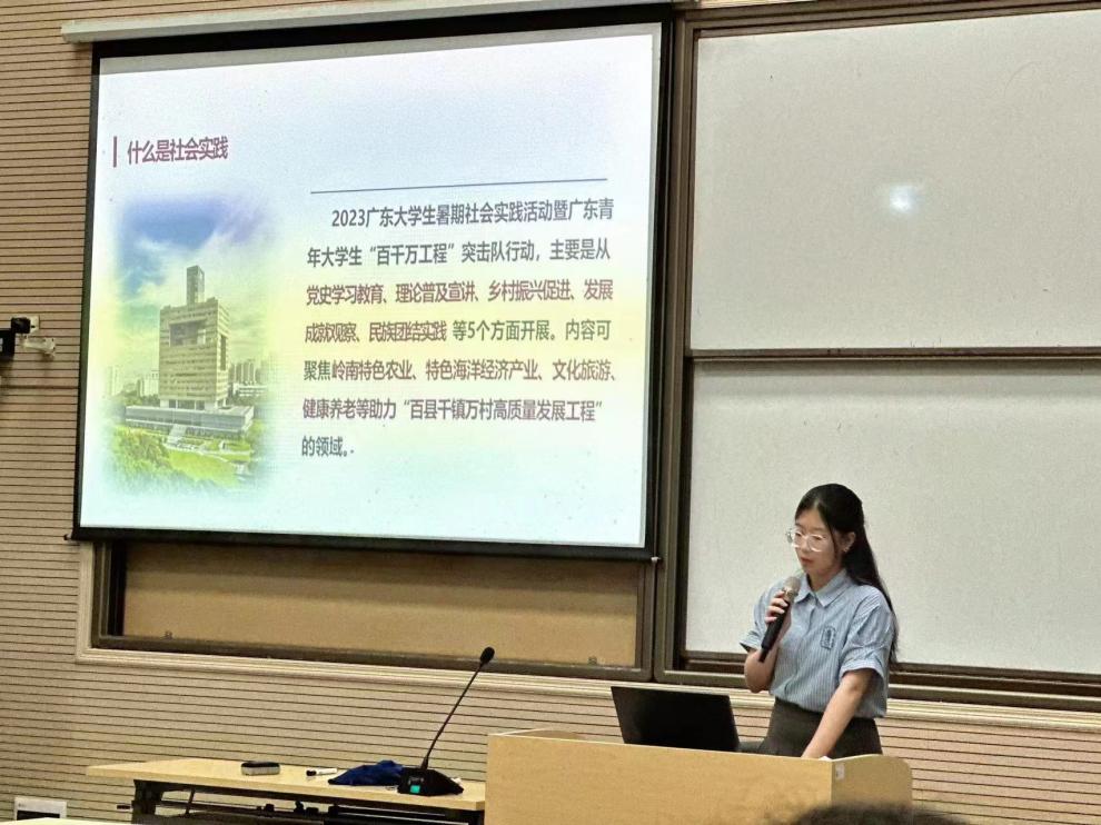 “社会实践的内涵是什么?我们为何要投身于社会实践?又该如何将其做到最好?”学院团委学生兼职副书记吴佳仪以三个深刻而富有启发性的问题开启了宣讲会的序幕。她以自己近期在社会实践工作中的学习感悟,深入浅出地阐述了社会实践的核心理念及对大学生的深远意义。