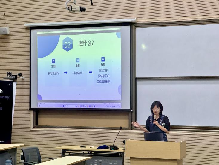 吴佳仪为大家介绍了本次学院暑期社会实践活动的主题——“行中国,看世界”,强调暑期社会实践活动是为了帮助学生了解国情、观察民情、服务社会的功能定位,以及学院对社会实践活动“五个一”的具体要求。面对同学们在填写预申报表时的困惑,吴佳仪就项目立项审核的关键步骤进行了详尽而清晰的解答。她特别强调项目规划时的准确性和可行性,建议同学们要紧紧围绕“五个一”的要求进行内容设计。