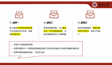 心理部的曹舒凝同学担任主持,她为大家简要介绍了本次活动的内容和目的,分享了同学们的投稿案例,如有些同学提到因为舍友外放游戏或者视频声音影响到别人,但不知如何沟通;宿舍同学间的卫生习惯不同,如何求同存异等等。