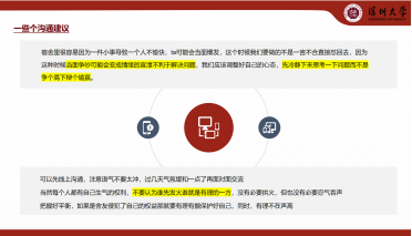 例如在部分舍友以自我为中心引发宿舍矛盾的案例中,同学们套用万能公式:现象 + 给我造成的后果 + 希望你如何改进的解决公式,提出解决沟通之道,“xx同学,你在宿舍过道堆放自己的东西,这样让我们在寝室都不方便,你可否把自己的东西放在自己的区域呀?”