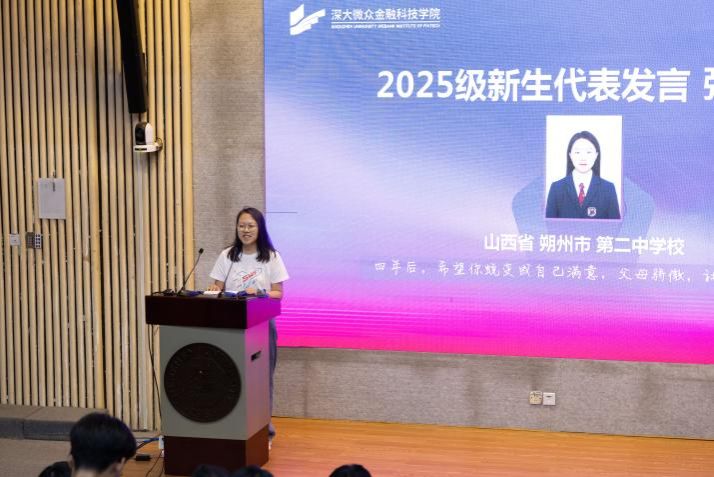 新生代表张婧婧以“为何而来”和深大的“三自精神”为引,分享了对大学的思考。她鼓励同学们在金融与科技的融合中学习锤炼真本领,以“自立”为基石,努力练就过硬的技能,为未来的挑战做好准备;以“自律”为准则,把握自由的边界,合理安排时间,培养良好的习惯,让自律成为一种生活方式;以“自强”为目标,积极回应时代的召唤,勇于探索未知领域,不断提升自我。期望与同学们携手共进,将深大“三自精神”融入未来成长之路,自立以成为自我,自律以成长自我,自强以成就自我。她呼吁大家牢记使命,用代码书写创新,以担当回应时代,在深大共同成长、实现自我价值。
