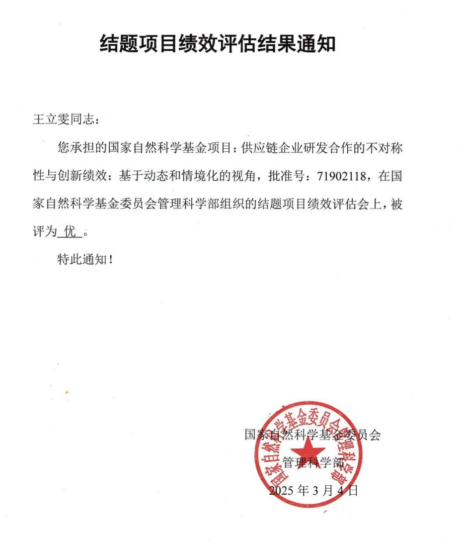 王立雯承担的国家自然科学基金项目:“供应链企业研发合作的不对称性与创新绩效:基于动态和情境化的视角”(批准号:71902118),在会上获评估为“优”。