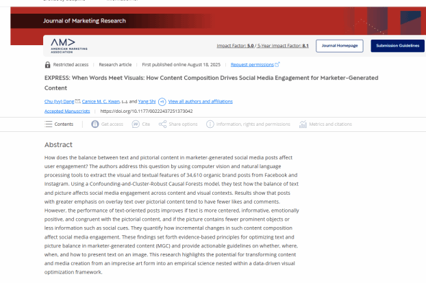研究结果显示,相较于更突出图片内容的帖子,强调覆盖文字的帖子往往获得更少的点赞和评论。然而,当文字更为居中、信息量更丰富、情感色彩更强,同时配图中显著物体较少,或文字内容积极、与图片保持一致并传递更多社交线索时,以文字为主的帖子表现会显著改善。此外,内容构成上的渐进式调整同样会影响用户参与度。本研究提出了优化营销人员生成内容(MGC)中文本与图片平衡的实证性原则,并为是否、在何处、何时以及如何在图像上呈现文字提供了可操作的指导。这一研究强调了将内容与媒体创作从一种经验性的艺术形式转化为嵌入数据驱动的视觉优化框架中的经验科学的可能性。(文章链接:https://journals.sagepub.com/doi/abs/10.1177/00222437251373042)