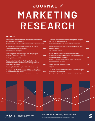 《Journal of Marketing Research》(JMR)是由美国市场营销协会(AMA)出版的国际顶级学术期刊,创刊于1964年。期刊主要发表市场营销领域高质量的实证研究和方法创新成果,涵盖消费者行为、广告与传播、品牌管理、数字与社交媒体、市场响应模型等主题。JMR强调学术研究与实践应用的结合,是市场营销学科最具影响力的期刊之一,也是美国德克萨斯大学达拉斯分校(University of Texas, Dallas)选出的用于评估国际商学院研究能力的24本学术期刊(简称UTD 24)之一。该论文的发表是我院高质量科研成果、高水平交叉学科建设的重要体现。