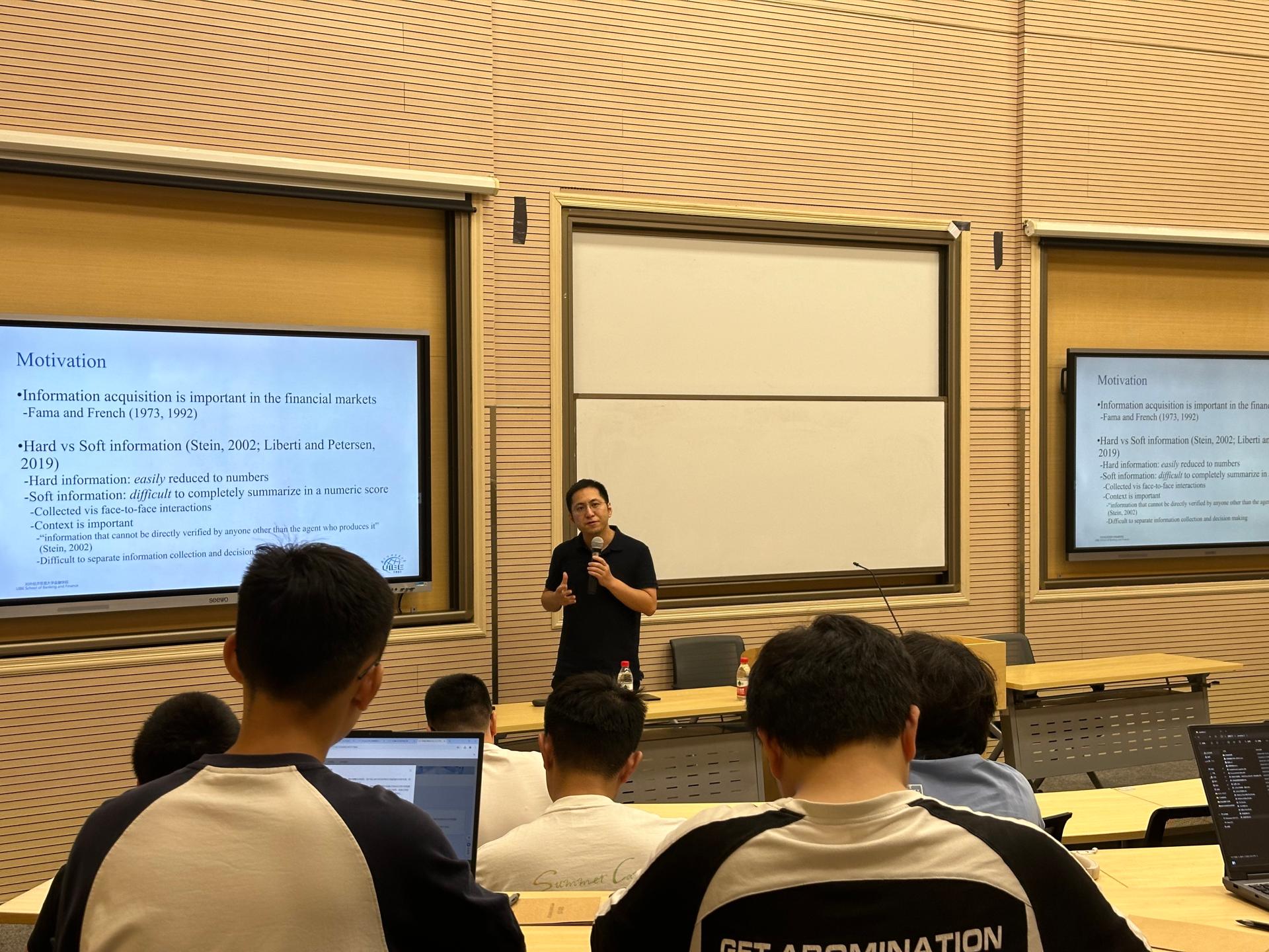 本次讲座中,屈源育副教授介绍了自己近期在资产定价领域的重要研究成果。主要内容为:Using detailed information on mutual fund manager company visits in China, we identify fund managers who engage in soft information acquisition to study how soft information is used in portfolio management. We find a clear divergence in fund managers’ preference for soft information. “Soft-information” managers hold fewer stocks and tend to invest in companies with high growth potential and significant idiosyncratic risk. Trades driven by soft-information acquisition are profitable, resulting in superior performance by these managers, especially in their holdings of stocks rich with soft information. Fund managers’ distinct preferences for soft vs. hard information create segmentation in both information acquisition and investments.