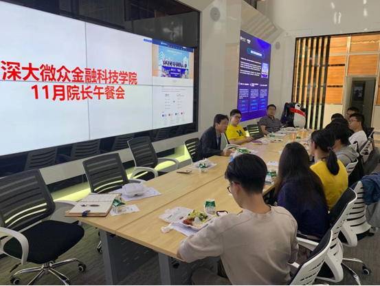 我院于11月26日中午在汇星楼一楼金融科技实验室举行了月度院长午餐会,学院张凯院长、各部门教师代表和8位本科和硕士生代表参加会议,对我院学生广泛关注的问题进行了交流。