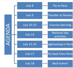 本次夏令营由深圳大学中外合作办学伙伴-法国南特商学院举办,为期十天的活动由专业课程学习,法国文化体验及参访三部分组成,具体内容如下: