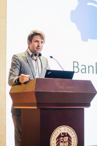 来自斯洛伐克的助理教授Vlado 作为金融科技学院教师代表发言,他简要分析了国际金融科技市场的发展态势,分享了金融科技的相关理念。他认为,学习金融科技的目的就是在于发现问题,抓住机遇,利用金融的思想和科技的手段找到解决方法并将其实现。