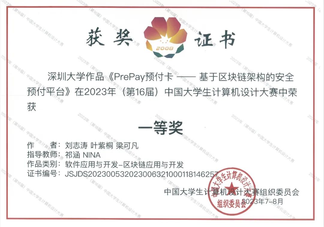 近日,2023年(第16届)中国大学生计算机设计大赛全国总决赛落下帷幕。在“软件应用与开发”奖项中,深大微众银行金融科技学院金融科技专业刘志涛、叶紫桐、梁可凡三位同学所做的“PrePay预付卡——基于区块链架构的安全预付平台”项目,荣获该奖项一等奖。指导教师为祁涵、尼娜。