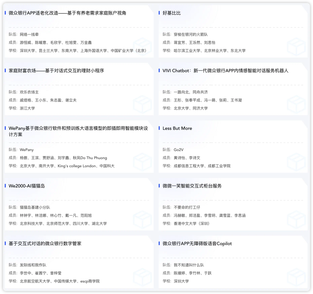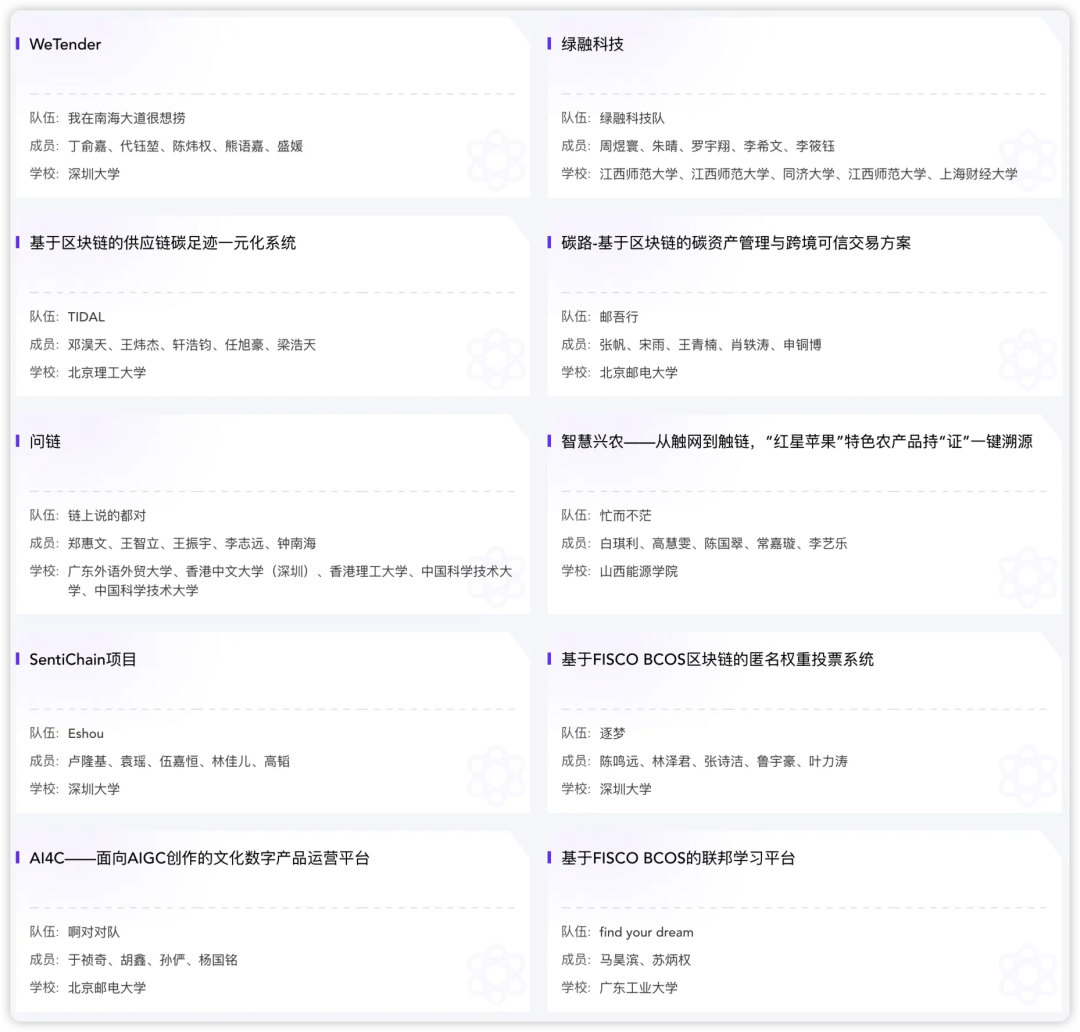 这是一场面向金融科技前沿技术领域的学生团队竞赛活动,大赛初赛报名及作品提交阶段共历时 43 天,向大赛组委会提交报名信息的 1500 余名学生组成了近 300 支学生队伍报名参赛,最终提交了 180+ 份作品。期间,来自深圳大学、清华大学、武汉大学、西安电子科技大学、中科院、微众银行等数十家学企单位专家评委通过技术公开课、线上答疑会、复赛答辩会等方式为赛队提出了专业建议,并对参赛作品进行了专业的评价和打分。经过初赛与复赛的激烈角逐、多位专家评委的综合评估与讨论,人工智能、区块链、产品经理三个赛道入围决赛的 30 支赛队名单终于出炉!以下为具体晋级名单(以下排名不分先后):