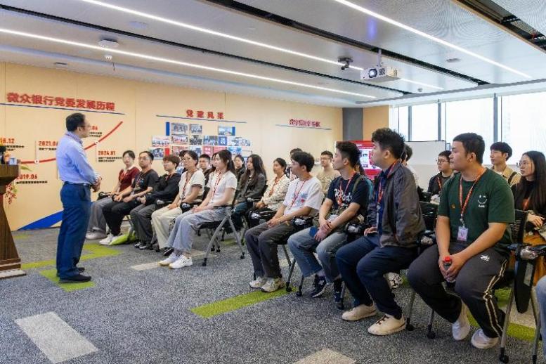 第三站,师生们走进微众银行,深入了解金融科技在普惠金融、数字金融领域的创新实践。微众银行作为普惠金融的先行者,秉承“让金融普惠大众”的使命,通过“自主创新,科技驱动”,探索出可持续的普惠金融发展路径。师生们在讲解员的引导中深入了解其业务模式与技术创新,感受金融科技在助力小微企业和创新创业、推动经济高质量发展方面迸发的巨大能量。同时大家也结合自身金融科技专业,就如何在未来职业生涯中践行社会主义核心价值观,利用专业知识为金融强国贡献力量进行了深度交流。