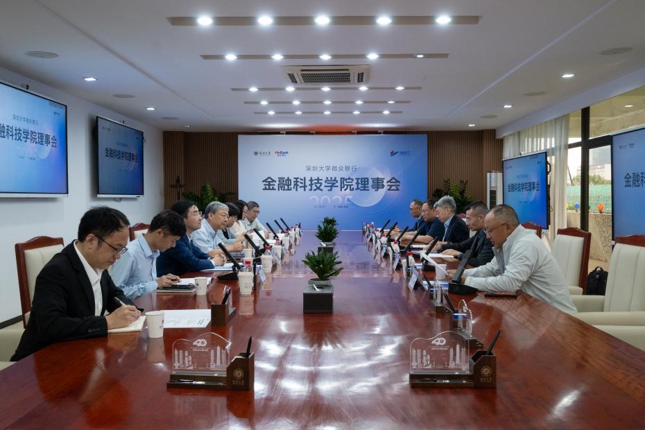2025年5月7日下午,深圳大学微众银行金融科技学院第六次理事会在粤海校区汇元楼401会议室举行。本次会议全面总结了学院2023-2024年度取得的办学成果,系统规划了2025年重点工作。全体理事会成员出席会议,会议由微众银行人力资源部总经理、微众银行金融科技学院企方副院长殷小永主持。