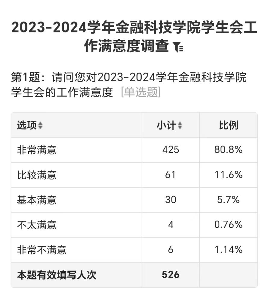 在本次调查中,金融科技学院2023-2024全体965名在读学生共提供526份有效问卷,参与率达54.51%。参与问卷的学生中对学生会满意度分为五个等级,分别为:非常满意、比较满意、基本满意、不太满意和非常不满意。现对调查结果予以公示,公示期为3天,满意度调查详细数据如下: