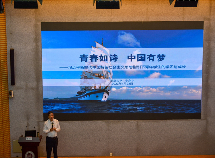 2021年4月23日上午,在科技楼2号报告厅深圳大学副校长李永华教授为全院师生带来了“思政第一课”,学院200多名师生积极参加,获益良多。讲座由张凯院长主持,首先,张凯院长通过播放《2021年深圳市第一期党性教育专题进修班纪实》分享自己在党校为期两周的学习过程中的一些所见所感,勉励同学们作为新时代的大学生,要不忘初心,牢记使命。要有爱有信仰,做一个有温度的人,“心中有爱,眼里有光,心中有善,脚下有远方”;要有...